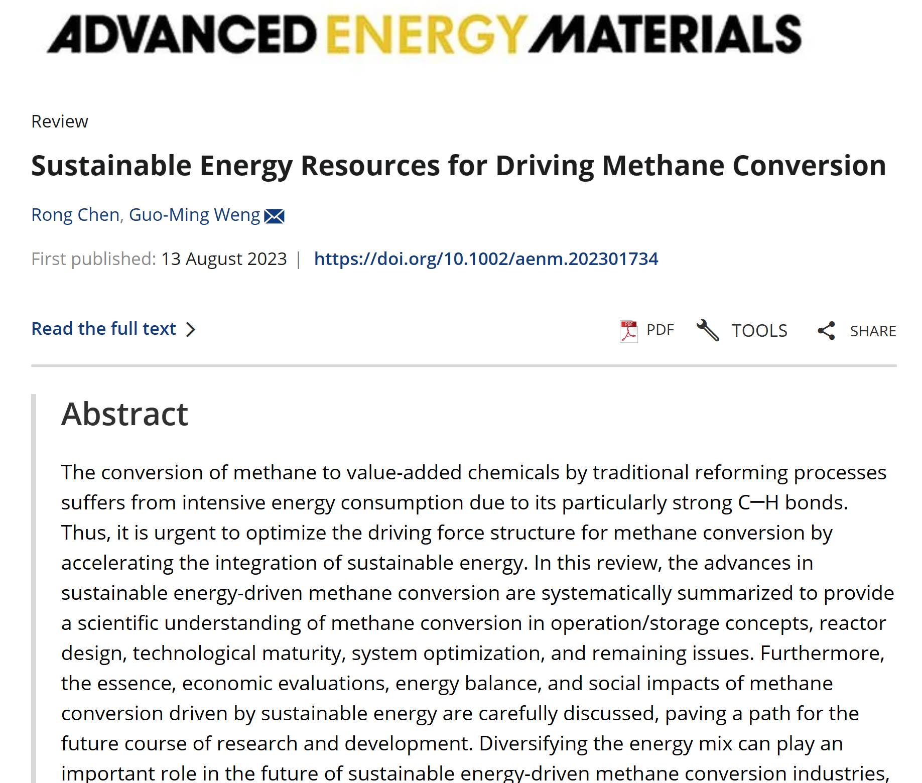 最近,上海交通大学氢科学中心的翁国明副教授课题组在能源材料领域期刊Advanced Energy Materials上发表了一篇题为“Sustainable Energy Resources for Driving Methane Conversion”的综述论文,上海交通大学作为唯一完成单位。该论文的第一作者是博士研究生陈容,通讯作者为翁国明副教授。