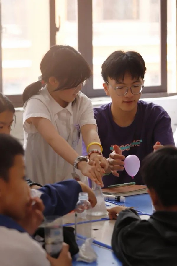 在清楚了解氢气球的制备步骤及相关注意事项后,孩子们分成小组,开始亲手制备氢气球。随着氢化镁颗粒遇水反应产生气泡,一个个成功制备的氢气球缓缓飘起,孩子们的脸上洋溢着喜悦与自豪。